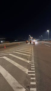 בתמונה נראית עבודת לילה בכביש פעיל, המבוצעת בליווי צוותי אבטחה מקצועיים מצוידים באפודי זוהר, ציוד סימון מתקדם וסימון שטח תקני